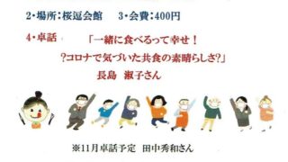お知らせ 10月例会(26日:水)卓話再開 長島さん 「一緒に食べるって幸せ!ーコロナで気づいた共食の素晴らしさ」楽しそうなお話しのようですね。3ケ月振りの卓話、長島さんも休会等有り約1年半ぶりですね。皆さんで楽しく、大いに語りあいましょう。9月例会で今後は「WITH コロナ」も視野に例会運...... 2022.10.07 お知らせ