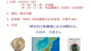 お知らせ 23年2月例会(22日)卓話小田川圭甫さん タイトルは「歴史的変革期にある国際社会」 激動期にある世界、豊富なデーターの付いたレジメで大いに学び、そして語りあいましょう。例会後、茶話懇話会も有り、楽しく集いましょう。なお卓話4-9月ご相談中ですが、6名中4名内定、皆さんメンバーは1...... 2023.02.21 お知らせ